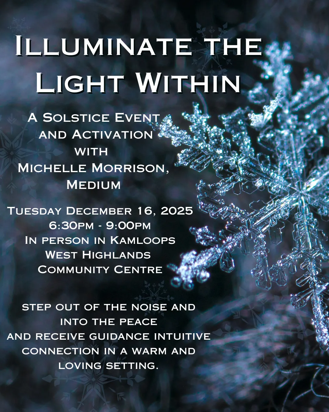 Join Michelle for an inspirational and uplifting evening designed to reconnect you with the divine support that surrounds you at this sacred turning point in time, the return of the light.